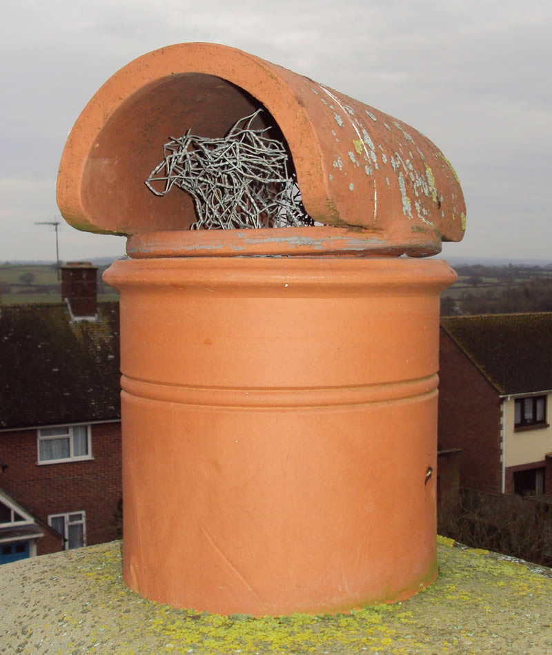 The type of cowl fitted was a Bonnet Top (above) which is not recommended for stoves or open fires as it restricts the air flow. Furthermore the previous installer had used rolled up chicken wire to protect against birds nesting; this had blocked up from soot thrown up by the fire (left) and restricted the flow further causing the smoking problem.